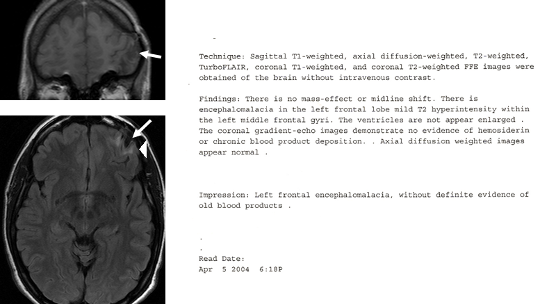 The result came as a shock to JS: Encephalomalacia in the left frontal lobe