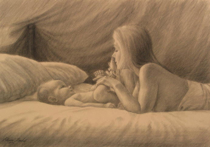 Elena Roché: Mother and Child, Morning Games (Charcoal on Velour Board, 2006) |