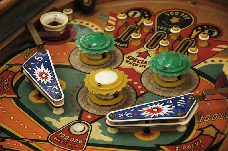 ein Flipperspiel. Die Kugel auf der schiefen Ebene. Von alleine geht es