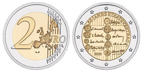 Memorial coin on the occasion of the 50th anniversary of the Austrian State Treaty. The signatures are from (left side) Wjatscheslaw Molotow, Iwan I. Iljitschow, Harold Macmillan, Sir Geoffrey Wallinger, and (right side) from John Foster Dulles, Llewellyn E. Thompson jr., Antoine Pinay, M. Roger Lalouette and Leopold Figl. |